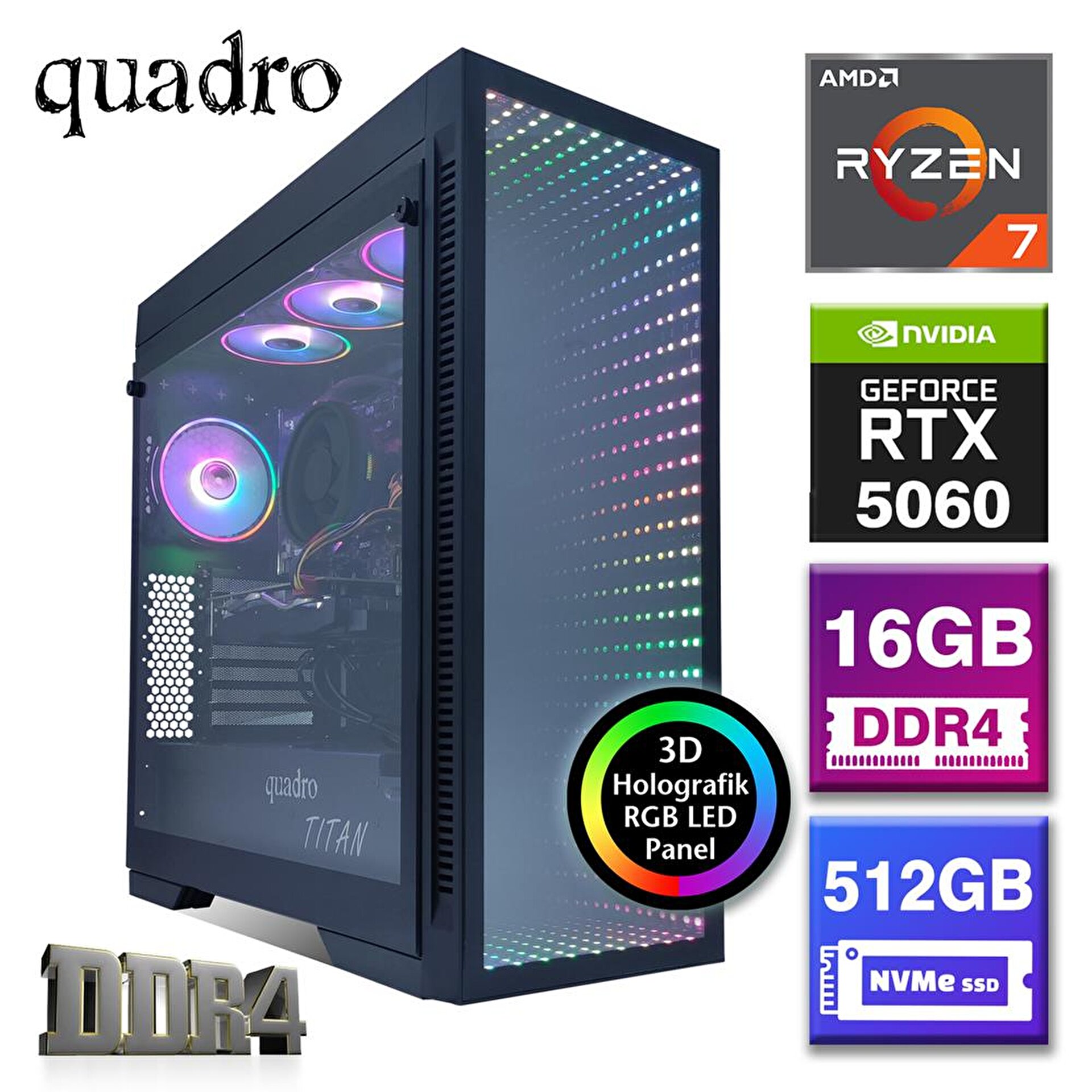 Quadro TITAN RX7 57165 Gaming Masaüstü Bilgisayar AMD Ryzen 7 5700 / 16gb DDR4 / 512GB NVME M.2 SSD / 8GB RTX5060 / Freedos